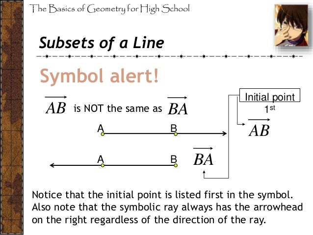 A ray is named with its endpoint in the first place followed by the direction in which its moving. Ray ab with endpoint a passing through b line through points a and b p ratio of circumference to diameter of a circle. Symbol symbol name meaning definition example angle.