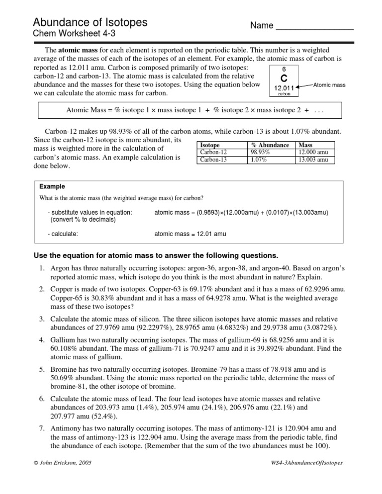 Average Atomic Mass Worksheet Average Atomic Mass Worksheet Name 1 Rubidium Has Two Common Isotopes 85rb And 87rb If The Abundance Of 85rb Is 72 2 And Course Hero