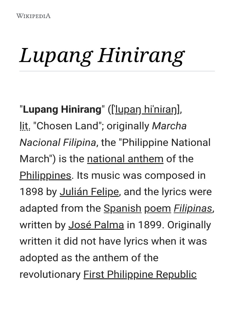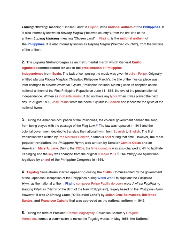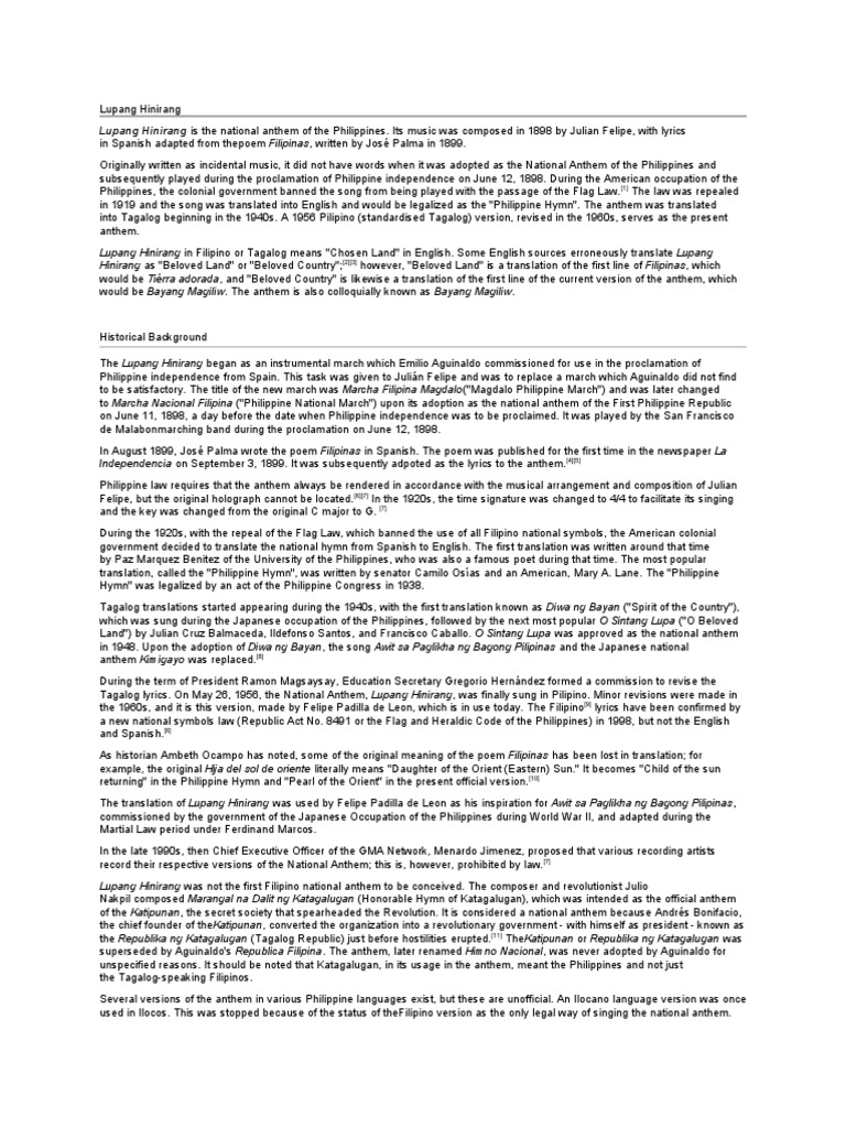 Lupang Hinirang Docx Lupang Hinirang Is The National Anthem Of The Philippines Its Music Was Composed In 1898 By Juli U00e1n Felipe And The Lyrics Were Course Hero