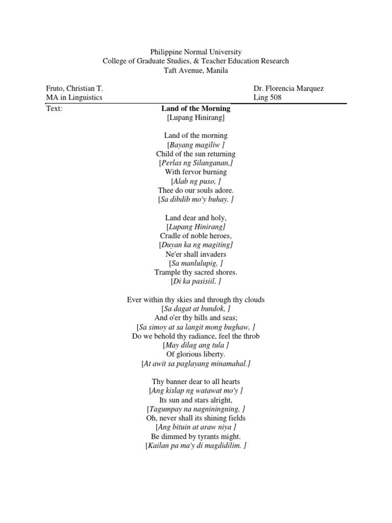 Pdf Isang Mapanuring Paghahambing Sa Ingles Filipino At Sebwanong Mga Salin Ng Orihinal Na Espanyol Na Lyrics Ng Pambansang Awit Ng Pilipinas A Comparative Analysis Of The English Filipino And Cebuano Translations